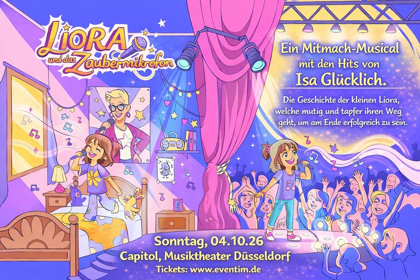 Wenn Kinderträume leuchten und Musik Herzen öffnet, beginnt etwas ganz Besonderes: Isa Glücklich feiert mit ihrem ersten eigenen Mitmach-Musical „Liora und das Zaubermikrofon“ große Premiere – am 4. Oktober 2026 im Capitol Theater Düsseldorf.